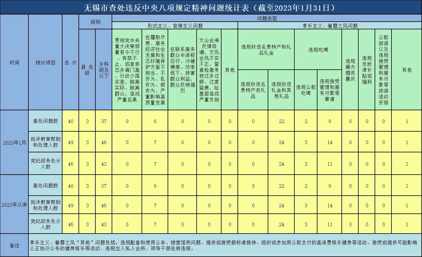 2023年以来,截至1月31日,全市查处违反中央八项规定精神问题情况如下: